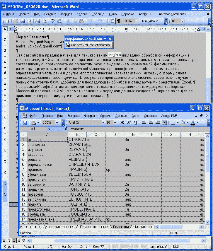Пакет использует для морфоанализа великолепный модуль RusLemmatizer (скажем огромное спасибо ребятам из группы www.aot.tu), привязка к Microsoft Office, в том числе и версии 2003 -- моя, все претензии по работе самого расширения предъявлять мне, по работе ядра морфоанализа -- им (правда, поскольку программа создавалась для сугубо личных целей, я кое-что упростил, в частности не стал реализовывать разбор анкодов, выдаваемых при задействовании режима "предсказательного" разбора).