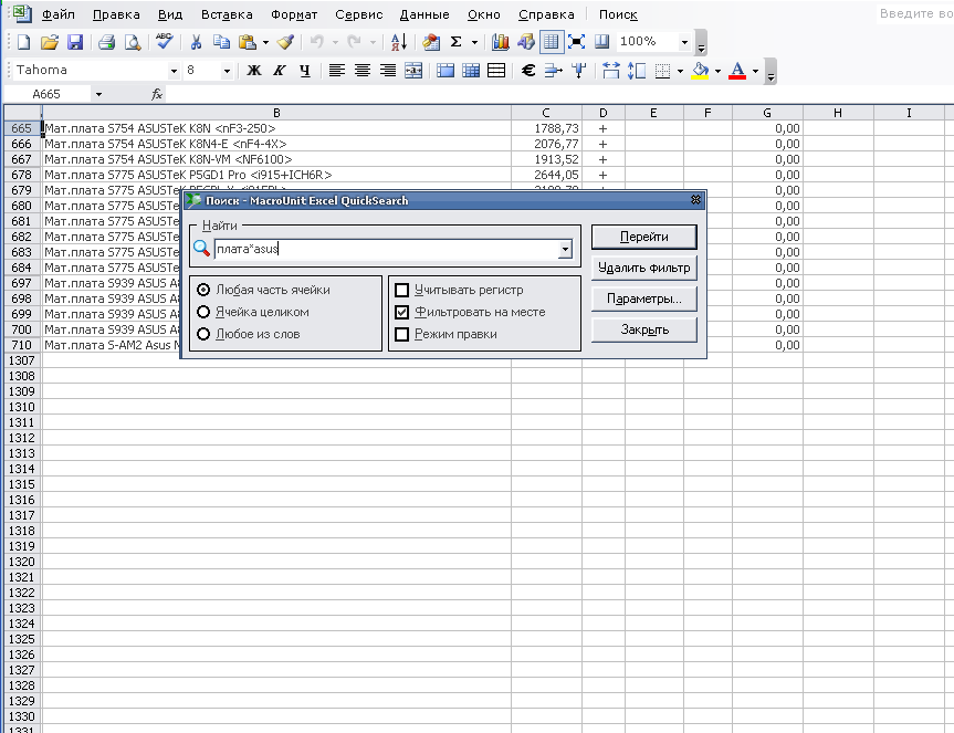 После того, как пользователь задает параметры поиска, данная программа «просматривает» построчно все записи на рабочем листе Excel. Для тех строк, для которых заданное условие поиска не соблюдено, изменяется высота строки, которая задается равной нулю. В результате на экране остаются только те строки, которые удовлетворяют заданному критерию. Таким «оригинальным» путем, фактически без установки фильтра, пользователь получает возможность видеть на экране только те строки, которые он ищет.