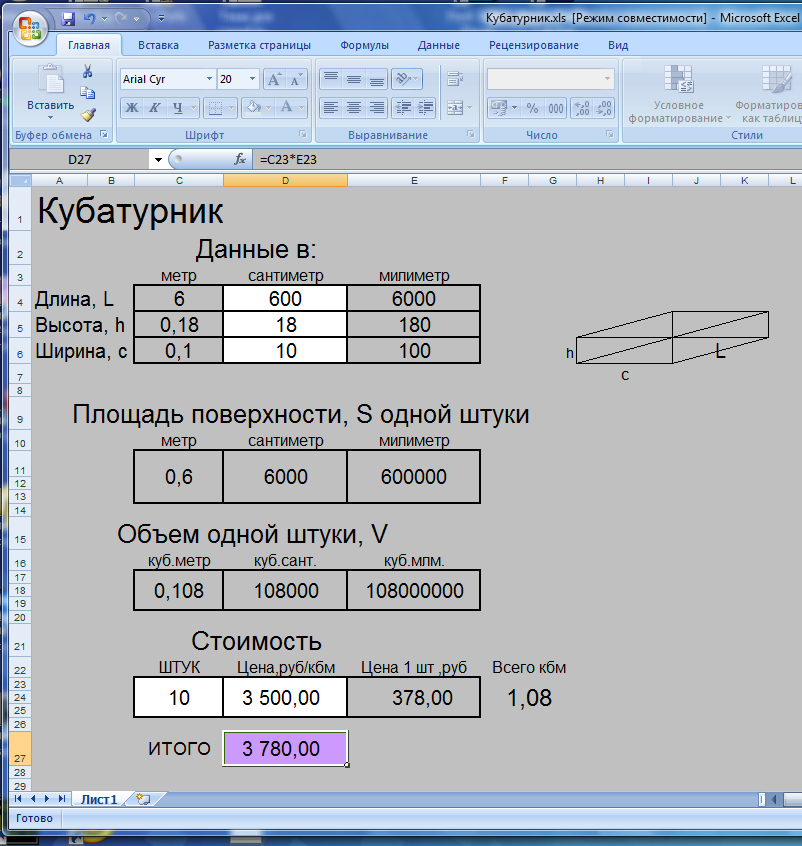 «Кубатурник» построен именно на этом принципе. Он обеспечивает расчет кубатуры, площади, а также стоимости для пиломатериалов или формовых изделий прямоугольной формы.